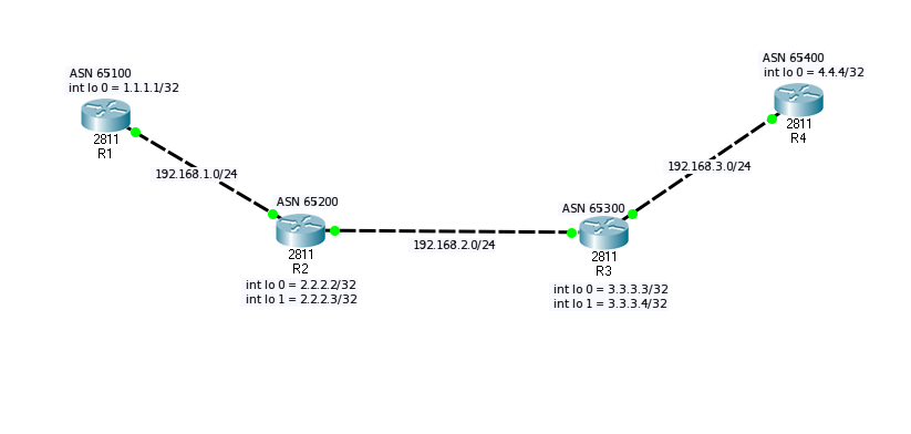 Router(config)#router bgp 65400Router(config-router)#no syncRouter(config-router)#bgp log-neighbor-changesRouter(config-router)#network 172.16.3.0 mask 255.255.255.0Router(config-router)#network 4.4.4.4 mask 255.255.255.255Router(config-router)#neighbor 172.16.3.1 remote-as 65300Router(config-router)#%BGP-5-ADJCHANGE: neighbor 172.16.3.1 Up